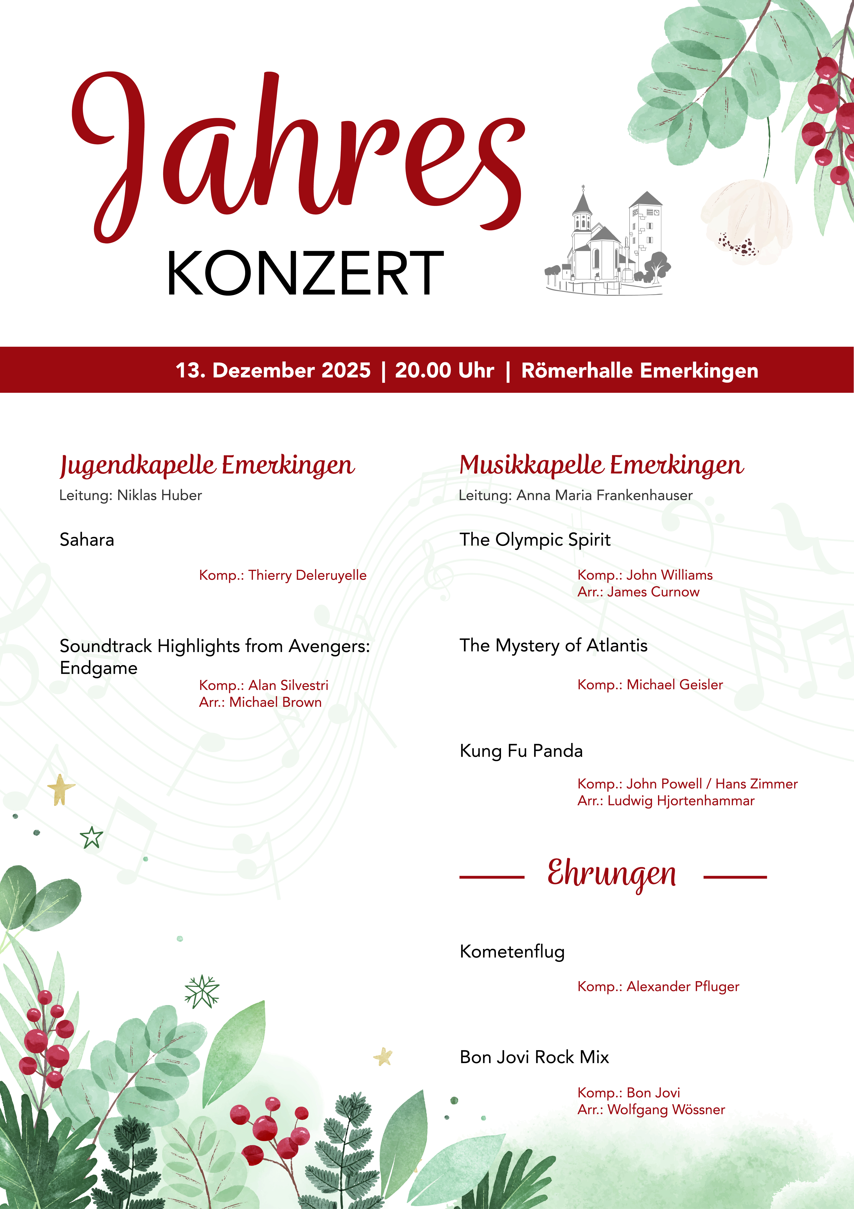 Wir möchten Sie bereits heute gerne zu unserem Jahreskonzert am Samstag, den 13.12.2025 ab 20 Uhr in der Römerhalle in Emerkingen recht herzlich einladen.